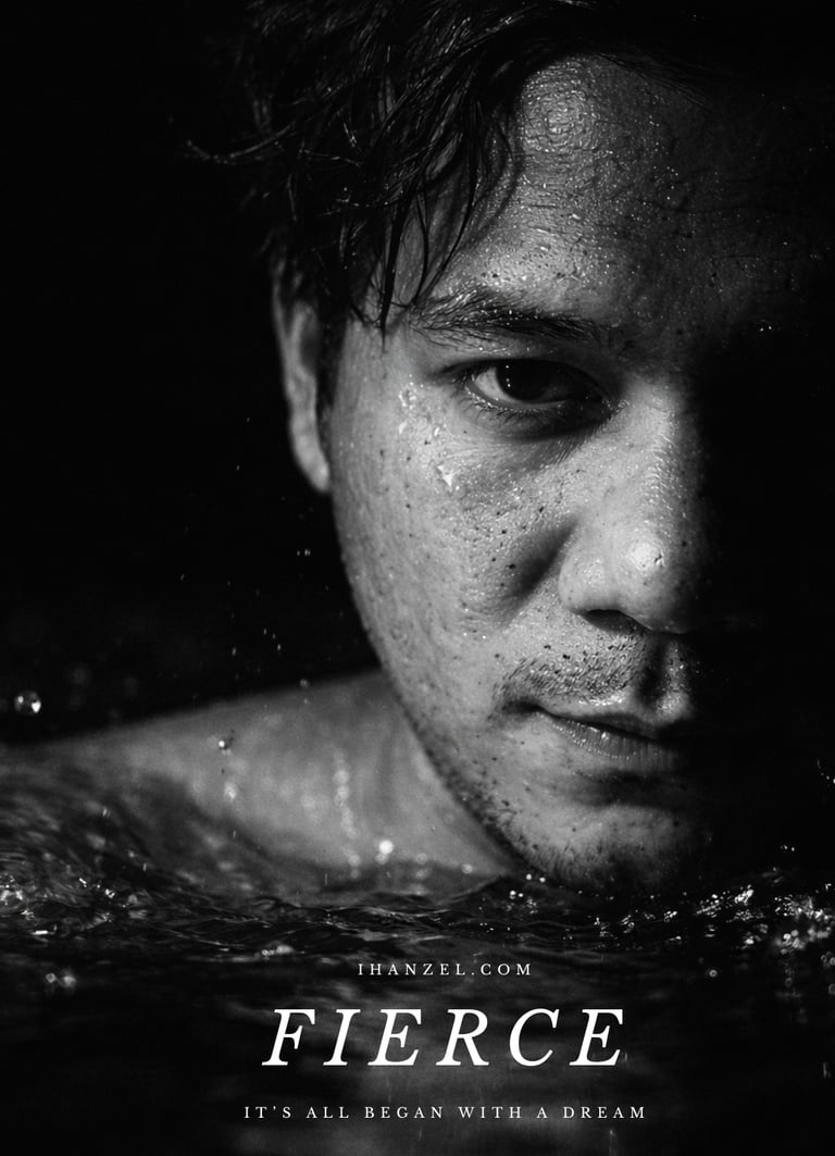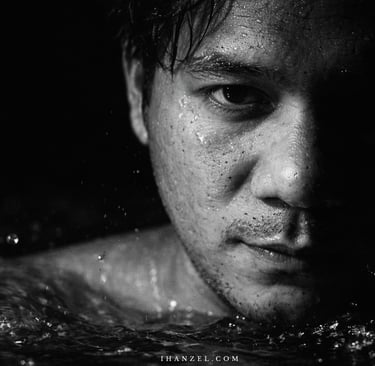 "Type ( Create a high contrast black and white close up portrait of the man in the picture. The image should depict only the right half of his face, partially submerged in water with droplets and bubbles visible on his skin and hair, illuminate the right side of the face dramatically, casting the rest into deep shadow, dark background, detail in skin texture, beard stubble and eye focus to evoke a moody cinematic atmosphere."